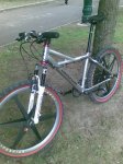 Bueno, por fin puedo poner fotos de la bici terminada, de momento está montada con una horquilla Marzocchi Marathon Race de 2006 (Olimpyc Edition) que será sustituida por una P-Bone NOS que ya está en mi poder. Falta cambiar la tija por una Thomson Masterpiece con retraso que montaré con un sillín Selle Italia Flite Clasic. Ni mucho menos es una clasica montada con piezas originales, no ha sido esa mi intención, he querido hacer un montaje con piezas que siempre quise tener y hasta ahora no habia conseguido (ruedas, frenos, potencia y manillar...). Destacar el funcionamiento de la dirección, una Woodman Saturn con rodamiento de aguja. Espectacular aunque esteticamente quede como un "tocho" Espero que os guste...