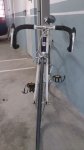 Bueno, después de mucho tiempo olvidada, y luego renovada para el rodillo, presento la bici en la que me inicié al mundo de la competición en mis años mozos, en alevines jejeje.Si que ha llovido sí.La heredé de mi padre y me quedaba supergrande en la época.Lo cierto es que creo que aun es grande para mí.Se le hicieron varias modificaciones en los 90, como los pedales automáticos LOOK Delta (no los tengo en las fotos) y se cambiaron las manetas por unas básicas Exage de Shimano con los cables por dentro del manillar.El sillín también se cambió porque se lo comió el perro (literalmente).Las ruedas tampoco son las originales, están por casa (son unas rígida con los bujes Shimano) pendientes de reparar,en las fotos son unas Mavic con bujes Campy y 8 piñones.El grupo entero es Shimano con 2x6v pero no hace mención a ninguna serie especial, supongo que era lo más básico de la época.Creo que la bici se compró en el 85 pero no lo aseguro.Los próximos cambios serán cinta manillar en azul como era originalmente, calapies de la época, ruedas Rigida con sus 6 piñones, zapatas de las tochas etc.Bueno su nombre es Motobecane Jubilee Sport, haber que me podéis contar los expertos de ella.Adjunto fotos con denominaciones de serie en cuadro y frenos.Saludos compis!!