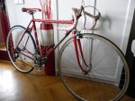Os dejo la mía a ver si os gusta, yo la tengo mucho cariño, fue la bici con la que empecé a correr en las carreras de escuelas hace ya unos años. Campagnolo Record y Super Record de la época. Le faltan sus pedales con rastrales y el sillín Selle San Marco que acabó con la piel demasiado perjudicada debido al abandono. Tendría que limpiarla y acondicionarla un poco... cuando me aburra ya tengo lio!! (Un post cojonudo, no lo había visitado todavía.)