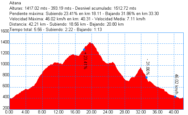 Gracias BUDYdj, de la subida al Comptador no me hables que cuando llegamos ya no estaba pa ná, me concentraba solo en respirar pues tenía un subidón de calor que si llego a ir solo tiro la bici y me hago una siestecita a la sombra. De todas formas yo creo que ese puerto a primera hora de la mañana lo hubieramos subido todos sin problemas, pero después del tute que llevabamos. En este grafico podeis ver que la rampa mas fuerte (23,41%) estaba subiendo a Aitana, pero como estabamos mas frescos se subió sin problemas. Salu2. 8)