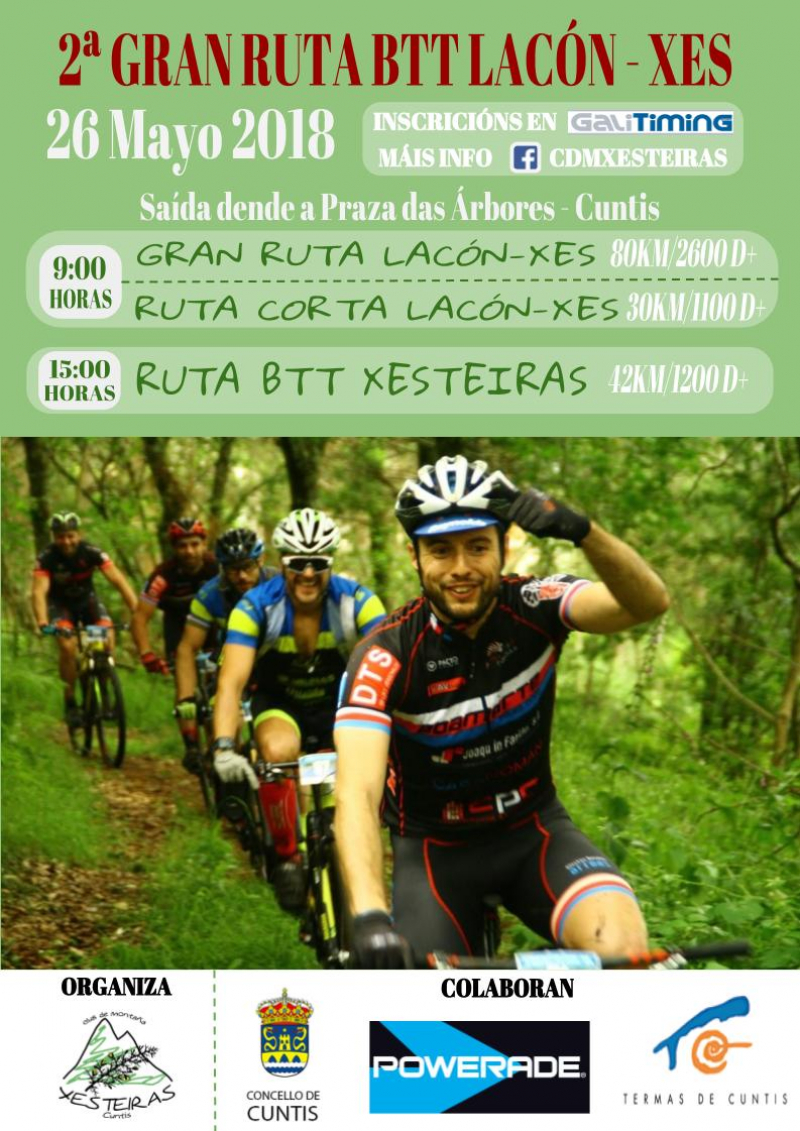 Salida desde la "Praza das Árbores" en Cuntis, a las 9:00 H. - GRAN RUTA BTT : 80 KM/2600M D+. - RUTA CORTA : 30 KM/1100M D+. Salida desde la "Praza das Árbores" en Cuntis, a las 15:00 H. - RUTA XESTEIRAS : 42 KM/1200M D+. Más información en FACEBOOK Inscripciones en www.galitiming.com