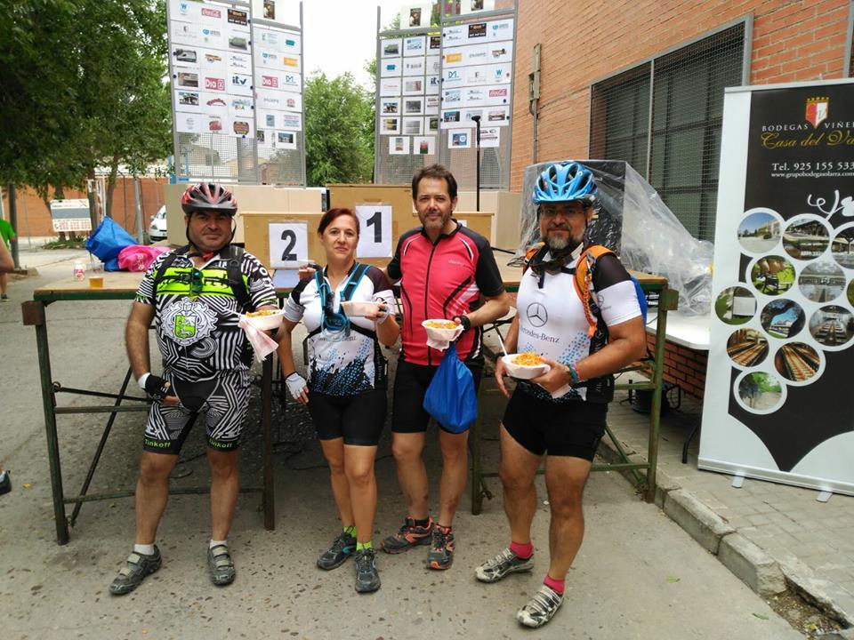 Por fin llego el día, durante las fiestas de San Luis Gonzaga en la localidad toledana de Yepes, en el que ha tenido lugar una recogida de alimentos no perecederos para los más necesitados a través de un llamamiento a todo aquel ciclista que quisiera entregar 2 Kg. de comida y disfrutar de uno de los dos recorridos propuestos por la organización. Un buen numero de voluntarios han hecho posible que haya sido todo un exito esta tercera edición durante los primeros días del verano y debo felicitar a todos lo que han hecho posible algo así. En un día como hoy, he podido disfrutar de la presencia de mi mujer y disfrutar con ella de esta actividad, y hemos optado por realizar la ruta corta, la más sencillata y acta para toda clase de publicos, el caso era pasar una buena mañana de bicicleta, mi mujer vaya cogiendo fondo, además de hacer una buena acción http://www.cicloide.com/nci_analisis_sr.php?REF=344936 Algunos, para quitarnos el "mono" de una ruta algo más exigente, hemos probado la CUESTA DE LA ALFONSA que tendría como culmen la Ruta Larga, una cuesta de unos 200 m. de distancia con un Desnivel + Acumulado de 28 m. con rampas que según lo lugaremos rozan el 28% y que aparece como SEGMENTO EN EL STRAVA. Como dato curioso, si bien es una cuestarraca de c*jones, creo que esta sobrevalorada (por los datos aportados por los dispositivos teléfonos moviles que no son tan finos a la hora de asignar la altitud de un punto) y según los datos aportados por la cartografía de altimetrias LIDAR del IGN nos encontrariamos con pendientes que rozan el 20% que ya esta bien y que duelen, donde la bicicleta pierde la horizontalidad, pero lejos de ese mito del 28%, pudiendo decir que tiene un ratio medio de subida del 15% con puntos que se acercan al 20%,que los que vienen de la "larga", de chuparse los 4 BARRANCOS, tiene que picar de narices. VIVA LA ALFONSA. Compartiendo camino con amigos con los que hemos coincidido en otras Marchas como son de izquierda a derecha, José y Juanjo, con los que ha sido, de nuevo, un placer ciclar en su compañia. A la llegada nos esperaban un plato de migas y tres consumiciones por el mero hecho de haber contribuido con la recogida de alimentos. Volveremos para realizar la "larga" y quitarnos la espinita de disfrutar de esos peazos de barrancos. GRACIAS A TODOS LOS QUE HAN HECHO POSIBLE ESTE DÍA.