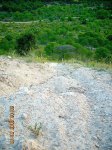 Cuando intento una trialera por primera vez voy lo más despacio que puedo y cuando pierdo un poco el control giro hacia un lado y pongo el pié,paso ese tramo ,vuelvo a montar y bajo el resto.Las difíciles casi nunca las bajo a la primera,pero sirve para conocer mejor la bajada y bajar con más confianza la próxima vez.El problema de hoy era que la caliza se había quedado muy dura y las piedrecitas de encima hacían que la bici no se sujetara en los tramos más inclinados,soltando un poco frenos se podían pasar esos tramos, pero no me arriesgo, que la última vez que solté porque perdía el control terminé con la rodilla como un botijo. La veo desde lejos y a por ella !: El plástico naranja es parte del guardabarros de una moto,habia varios trocitos. Al bajar,en este tramo la rueda trasera pasó a la delantera y cuerpo a tierra. la segunda de la tarde: con el mismo resultado,otra vez será.