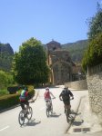 Salimos de Atarés para subir por el precioso pueblecito de la falda de Sandiniés, llano para mi gusto, en una ruta equilibrada y perfilada con un conocimiento escaso. Para empezar las rampas del 15 al 20% nos recibían con alegría. Nuestros muslámenes se retorcían sobre el pedal en busca de escapatoria pero lo tenían fatal. Un calentamiento más que sobrao para meternos en harina. En poc más de media hora de pista engravada compactada con lavadoras (porque macho las bolas eran del tamaño de la cabeca de un crío pequeño) conseguimos llegar a la entrada de la senda que nos llevará a la torre del Moro. Dicho y hecho. Por fin un descanso. Bajadica y senda a tutiplén. Hasta el final y el GR del Camino de Santiago. Diversión y curvas por igual, saltos y barzas, boj, helechos y hasta algún que otro mosquito dando sabor al paladar.