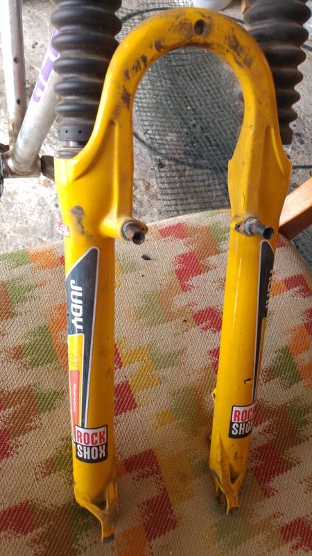 Es un cuadro Alkon Al 7020 (no se que modelo) con una horquilla Rock Shox. Una potencia tioga y un manillar doble altura vete a saber de que marca.. Queda una llanta delantera Mavic