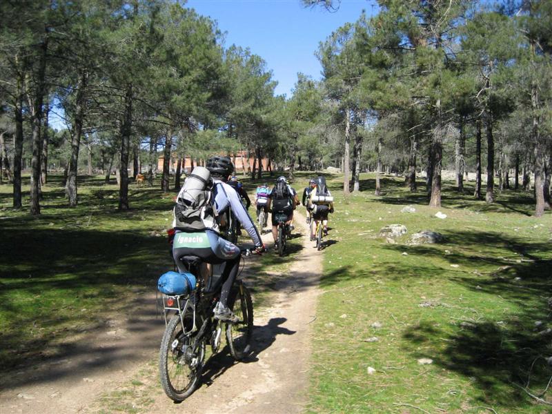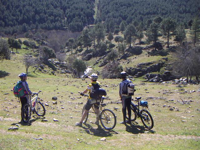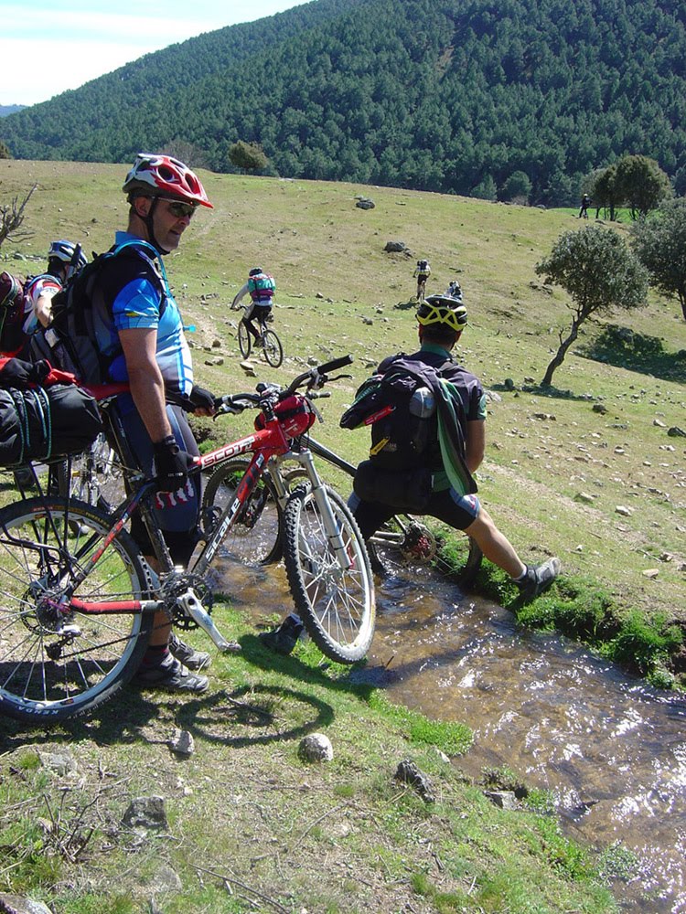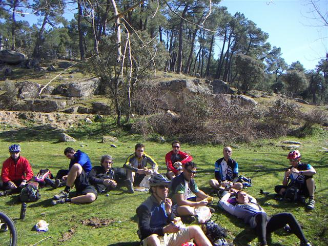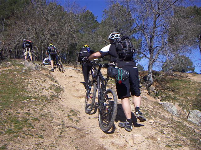 Finde RE-distinto Crónica by Nanotrón Premisas iniciales de la propuesta. 1.-Inédita. 2.-¿100 Km de ida? Por decir algo. 3.-Sé hacerla de ida aproximadamente pero ni idea de hacerla de vuelta. 4.-Acaba muy lejos de los coches, con lo que habrá que improvisar si no queremos desandar lo andado, volver por carretera, aventurarnos a improvisar una vuelta por orientación (SIN GPS), o incluso quedarse a dormir en alguna pensión o paridera del camino si se nos echa la noche, para acabarla el domingo. 5.-Hay que llevar bocata. 6.-Hace mucho que no la hago, si nos perdemos no se considera la opción “llorar”. 7.-Incluye dos duros pateos. 8. Sin GPS. Solo el sol, brújula y mapa. Con estas vagas premisas nos apuntamos sin saber donde nos metemos 18. La cosa promete. Estamos a viernes por la mañana y aun no sabemos ni el punto de salida, ya que gran parte del encanto de la ruta reside en la aventura. El viernes por la noche nos dan las coordenadas y los nuevos valores. 1.- Salida del puerto de la Cruz Verde a las 9:15 hora zulú. 2.- Llevar saco, esterilla y lo necesario para hacer noche en una posada. 3.- Bebida y comida para lo que se tercie. 4.- 70 Km. de ida y algo mas de vuelta ya que es circular. Todo esto con mapa de los de toda la vida e improvisando. Ante estas nuevas directrices el sábado apareceremos 11 chalaos con trasportines, alforjas o mochilas, según cada cual, dispuestos a lo que sea. Alexandros, Picachu, Tepuy, Devid, JC_Blazquez, JuanquiBTT, Santiago, Ignacio, DDream, Alexpin y yo. Sábado: Son las 9:15 y ya estamos casi todos listos, últimos ajustes en los trasportines, cada uno sujeta sus pertenencias como puede a la bici o a la espalda y, ¡comienza la aventura! Enfilamos del puerto de la Cruz Verde a la Hoya, primero por senderito y luego bajada rápida por pista. Llegamos a un río y nos espera el primer pateo del día, aunque casi todo se puede hacer montado si sabes lo que te espera de ruta jeje. Ignacio nos cuenta que eso se sube con el TT. ¡Hace falta tenerlos puestos porque hay cada pedrolo y tiene una inclinación del carajo! Entre el cruce del río Cofio y unas preciosas subidas y bajadas por pinares con unas vistas muy chulas llegamos a las navas del marques, donde algunos paran a desayunar en una pastelería. Unas cuantas pistas y pinares y cruzamos el arroyo Retuerta, subidita, algo de carretera y paramos a comer en un páramo precioso del arroyo Majalobos. Al salir Picachu pincha y nos metemos un rato con él mientras que arregla el pinchazo para matar el rato. Pista con toboganes que a alguno se le comienza a atragantar y divisamos San Bartolomé de Pinares. La pista baja directamente y esta casi asfaltada, sale una senda trialera muy chula a la izquierda. En un momento dado se pierde y terminamos haciendo un poco de escalada para llegar finalmente a la base del pueblo. Donde aprovechamos para rellenar y beber en una fuente con un chorro potente de agua no potable pero que los habitantes del pueblo nos aseguran que esta buena. Picachu no ha quitado el pincho en el pinchazo anterior así que ha vuelto a ir con la rueda desinflada hasta aquí y ahora por fin se arregla del todo. Tiramos unos Km. por carretera hasta enlazar una pista que nos llevara tras una subidita interesante a la carretera que nos dejara en El Barraco, nuestro lugar de destino. Teóricamente deberíamos haber llegado por una pista pero seguir un mapa y una brújula es el aliciente que tiene, se improvisa y decide sobre la marcha. 17:30. Nos agrupamos en el pueblo ya que la subida ha producido una romería de ciclistas y vamos a EL CHATO, el bar posada donde pernoctaremos. Aquí nos atienden perfectamente. El dueño es ciclista (de carretera pero se lo perdonaremos) y lo tiene todo preparado. Corre la cerveza y la coca cola a raudales durante toda la tarde mientras que vamos subiendo a las habitaciones a ducharnos porque cambiarse... realmente casi nadie tiene mucho que cambiar. La madre de David (el dueño) ha tenido la genial idea de comprar unos bollitos y nos tiramos como lobos hambrientos a las bandejas que nos pone. Tenemos una sorpresa reservada. Ender, MiriaM y Nanotrón van a venir a dormir y salen con nosotros el domingo. No podían unirse el sábado pero no querían perderse la excursión. Hay un ligero problema. Somos 14 y hay 7 camas así que repartimos a suertes las camas y el resto usará las esterillas y sacos para dormir a los pies de los afortunados. Para variar a mi me toca suelo, pero DDream se porta genial y me cambia su cama por el suelo, (gracias mil dani!!!) Entre cervezas y risas es la hora de cenar el prometido cabrito así que pasamos al restaurante. ¡Menuda panda de hambrientos! El pan cae antes de llegar los entrantes y las ensaladas y nos ponemos ciegos de cabrito pero lo mejor esta por llegar. De postre hay flan y arroz con leche casero y helado. El dueño nos recomienda el flan y alguno desestima sus consejos pero cuando oye las alabanzas del resto comenzamos a repetir flanes y le acabamos la reserva ¡Menudo festín! Para finalizar la velada nos pasamos al bar de al lado que ponen el futbol. Entre mi animadversión al futbol y el humo que había y la buena disposición de mis compañeros de habitación a salir del tugurio nos vamos a dormir a 20 minutos del final del partido. Nosotros tenemos una habitación muy tranquila pero en la de DDream y Nano se oyen carcajadas y risas durante un tiempo. Todos a dormir que mañana a las 7 toca diana. Domingo: Son las 7 de la mañana ¡Todo el mundo en pie! Picachu tiene mala cara. Dice que tiene diarrea (no se le puede sacar fuera de casa a beber en el campo) y le duele la espalda. La mochila y el suelo no son buenos consejeros para la espalda. Alexandros y Deivid se hacen los remolones y entre eso y el pinchazo prematuro en la bici de Nano (el cree que algún familiar se la tiene jurada para que no monte...) salimos a eso de las 8:20. hace una mañana fantástica aunque comienza fresquita. Es nuestra gran