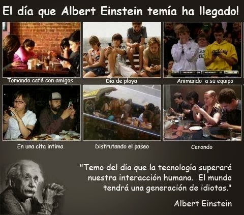 Yo le mande en un correo la cita de Einstein que has puesto al principio a mi cuñada que esta todo el **** día wasapeando y me respondió (via mail claro está): "Es que el móvil me hace mucha compañía" ¡Te cagas! Algún día nos daremos cuenta, al necesitar de alguien, que un móvil no te levanta si caes, no te visita en el hospital ni te da un abrazo en esos momentos jodidos