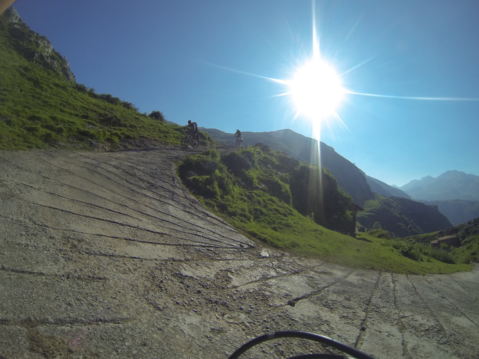 Comienza el día con una potente bajada de 9 km. hasta Espinama y un ascenso de 5 km. hasta Fuente Dé, la base del teleférico. Descendemos mil metros que posteriormente deberemos de recuperar ascendiendo a Pandetrave. En Fuente Dé arranca la pista con duras subidas que nos tomamos con tranquilidad y reservándonos pensando en los días que quedan por delante, aunque empezamos a ser optimistas viendo que las previsiones de los 16.000 metros anunciados son un error.